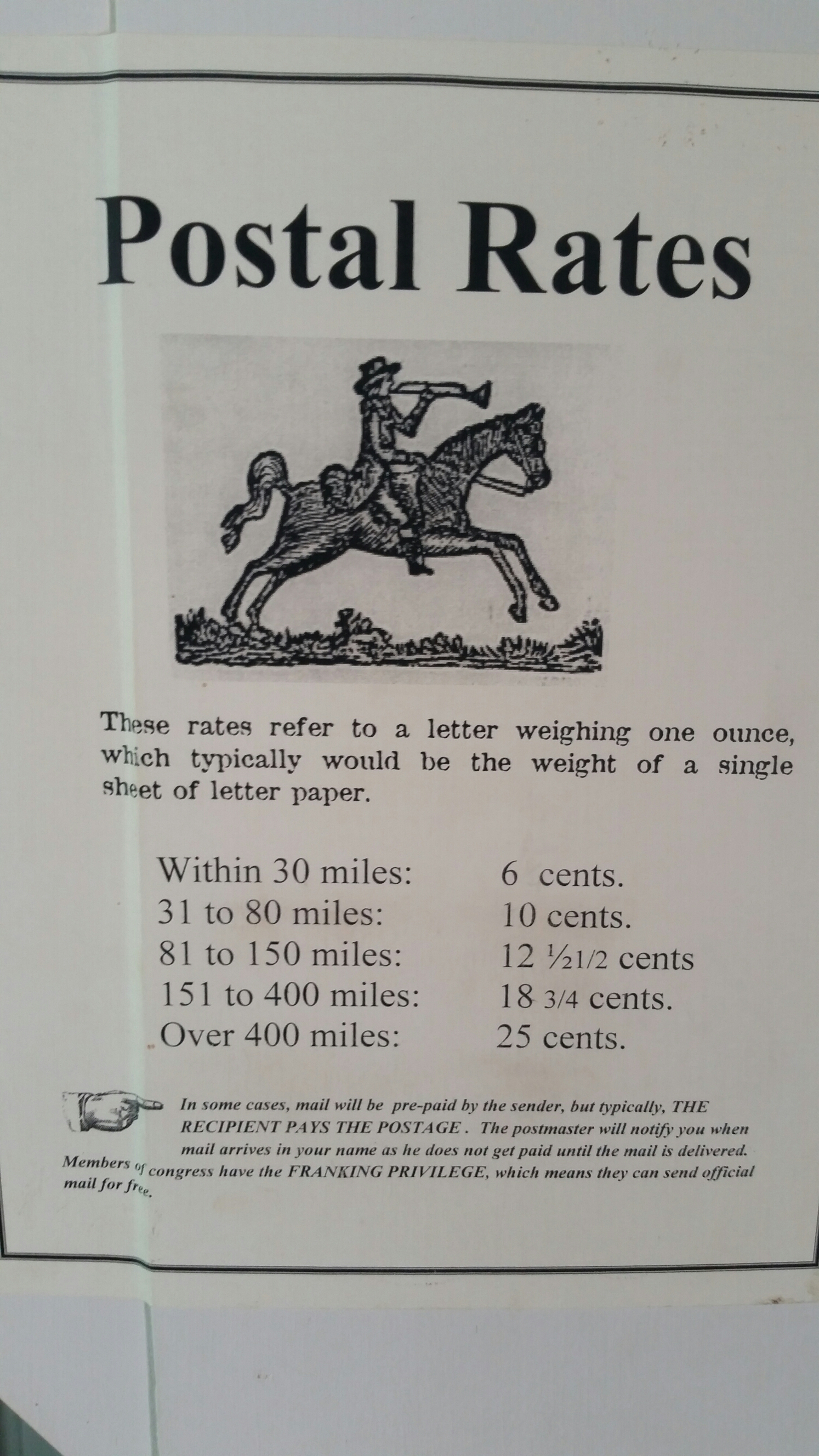 July 31, 2015July 31, 2015 by Hoosier Econ U.S. Postal Prices in the 1860’s Dollar, Economics, Financial, Indiana, Indianapolis, United States Government civil war era, Fed Ex, history, mail, pony express, UPS, USPS Leave a comment Visited a historical settlement site today and found this economic posting for the post office. Rate this:Share this: Click to email a link to a friend (Opens in new window) Email Click to print (Opens in new window) Print Click to share on Facebook (Opens in new window) Facebook Click to share on Reddit (Opens in new window) Reddit Click to share on X (Opens in new window) X Click to share on Tumblr (Opens in new window) Tumblr Click to share on Pinterest (Opens in new window) Pinterest Like Loading...