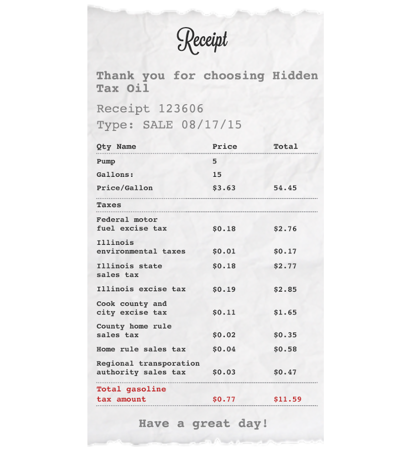 Illinois Policy, economic think tank in Illinois, did a write up(full story here) of what your gasoline receipt should look like when you get gas. In their demonstration they used Chicago. Some taxes may not apply to other areas but this is a good example overall.