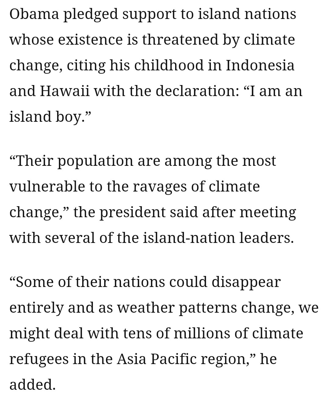 President Obama gave a long interview which can be accessed here via Washington Post. For some reason, climate change conferences each year get crazier and crazier in global disaster predictions. Now the President has put Asia on alert they maybe swallowed up by the Pacific Ocean:
