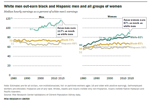 In 2015, average hourly wages for black and Hispanic men were $15 and $14, respectively, compared with $21 for white men. Only the hourly earnings of Asian men ($24) outpaced those of white men.
