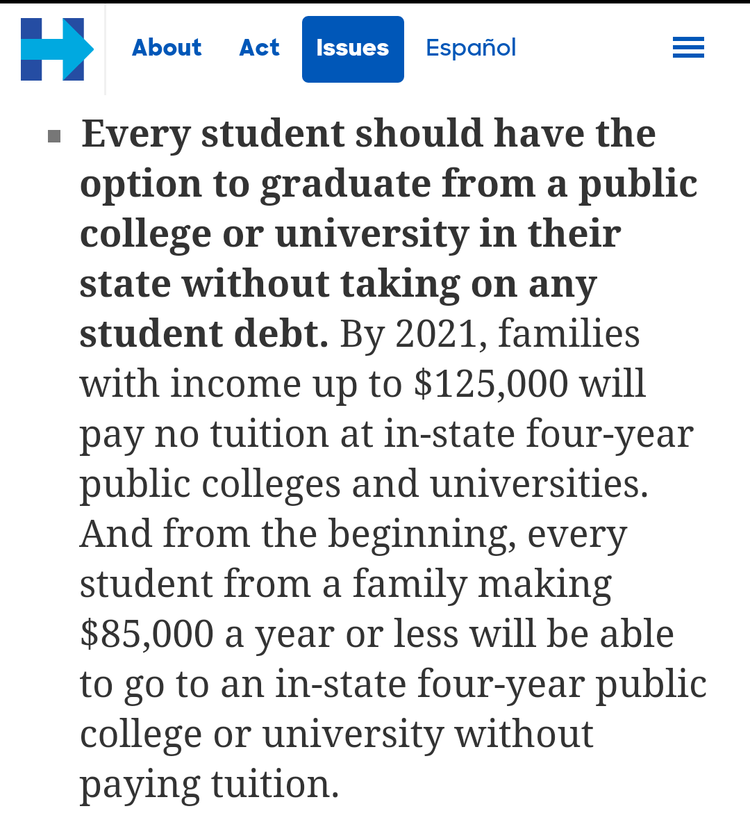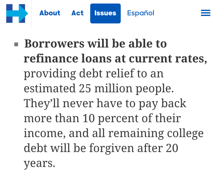 Democrats started shifting their campaign focus 6-8 years ago to people with college debt. Bernie Sanders and Hillary Clinton made big promises on this issue while campaigning with populist slogans of  “Free tuition” and “loan forgiveness”. Since Hillary is the Democratic nominee, here are her main points on student debt from her website: