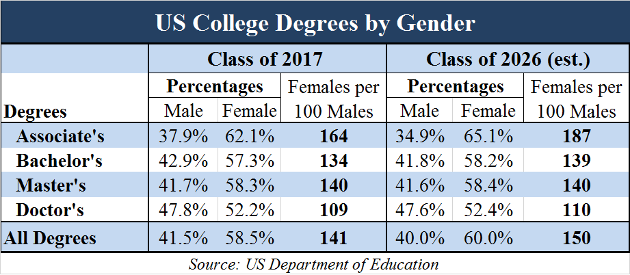 Based on Department of Education estimates, women will earn a disproportionate share of college degrees at every level of higher education in 2017 for the eleventh straight year (since 2007 when women first earned a majority of doctoral degrees). Overall, women in the Class of 2017 will earn 141 college degrees at all levels for every 100 men (up from 139 last year), and there will be a 659,000 college degree gap (up from 610,000 last year) in favor of women for this year’s college graduates (2.26 million total degrees for women vs. 1.6 million total degrees for men).