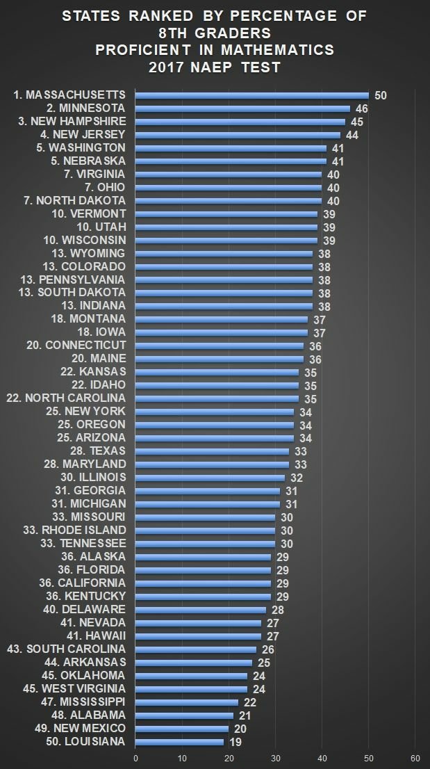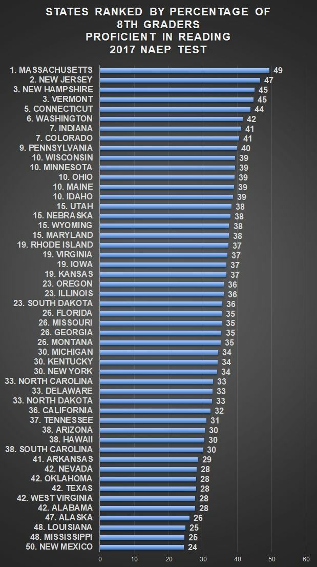 Indiana overall ranked 13th in math and 7th in reading proficiency.