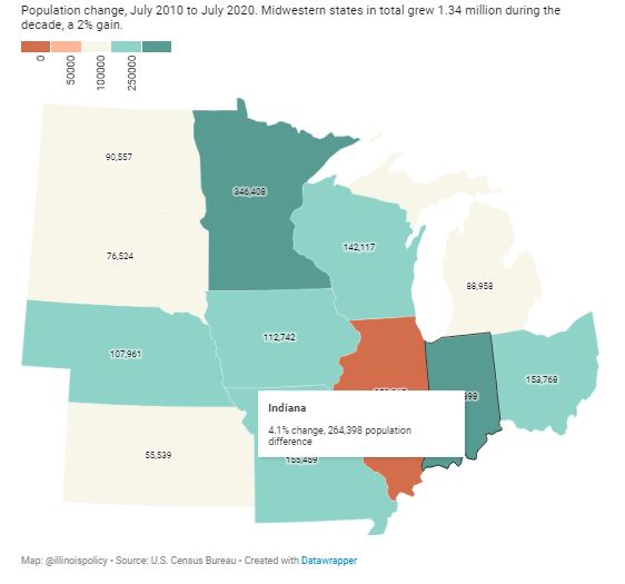 January 26, 2021 by Hoosier Econ Indiana Population Grew Between 2010-2020 Business, Economics, Education, Farming, Financial, Government, Indiana, Indianapolis Business, census, Indiana, midwest, Money, population growth, Taxes Leave a comment Indiana had one of the biggest gains for population growth in the Midwest according to results from a recent study. According to Illinois Policy, Indiana’s population grew 4.1% during 2010-2020 time period. Rate this:Share this: Click to email a link to a friend (Opens in new window) Email Click to print (Opens in new window) Print Click to share on Facebook (Opens in new window) Facebook Click to share on Reddit (Opens in new window) Reddit Click to share on X (Opens in new window) X Click to share on Tumblr (Opens in new window) Tumblr Click to share on Pinterest (Opens in new window) Pinterest Like Loading... Related