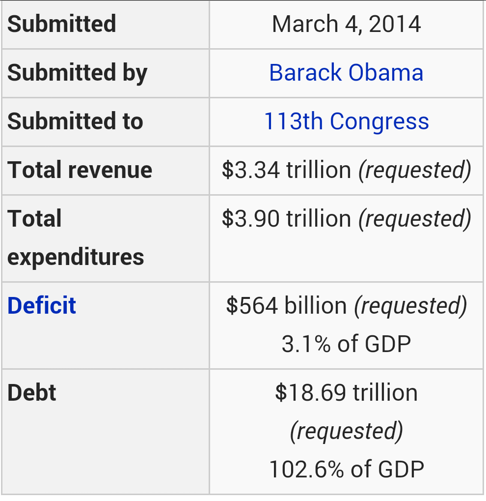 Here’s a snapshot of 2015 proposed spending and tax revenues from the President. Deficits and debt still accumulate at an historical rate.