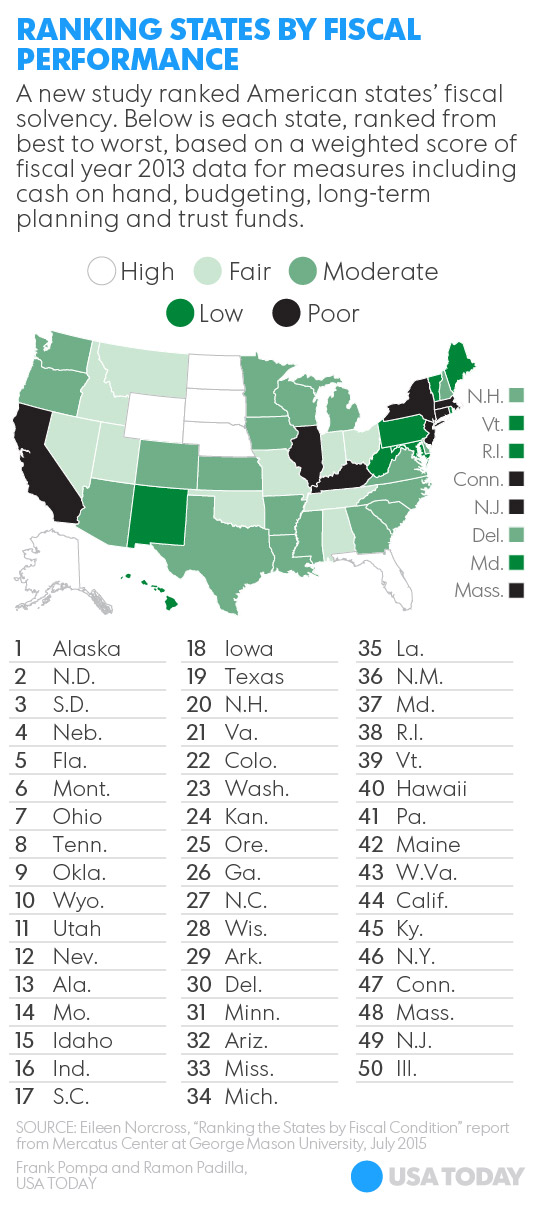 The Mercatus Center, a public policy research group, ranked the 50 states based on how well each state government planned spending in fiscal 2013 — the most recent year for which data was available — as well as their future financial prospects. from annual budgeting to cash to pay bills, to funding for pensions and long-term plans.